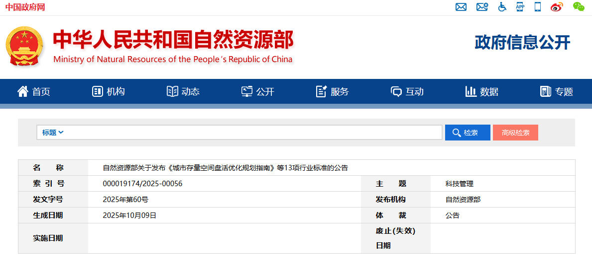 《城市存量空间盘活优化规划指南》等13项行业标准已通过全国自然资源与国土空间规划标准化技术委员会审查,经2025年第5次部长办公会审议通过,现予批准发布。